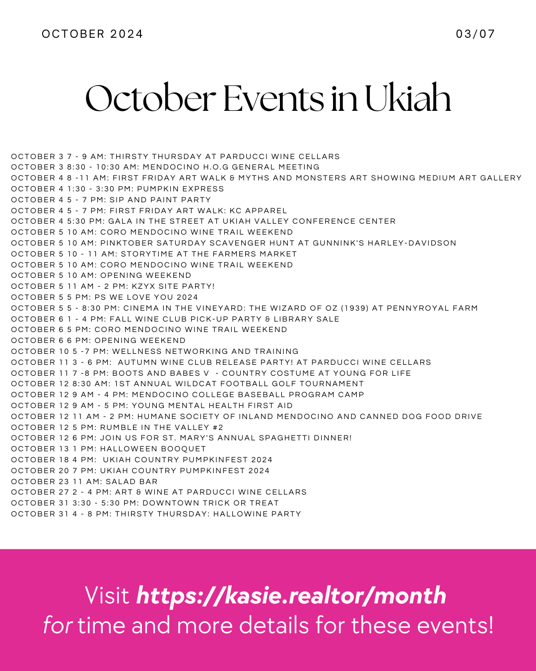 Looking for something fun to do in Ukiah this October? Check out these exciting events happening around the area. From wine tasting to art walks, there's something for everyone!